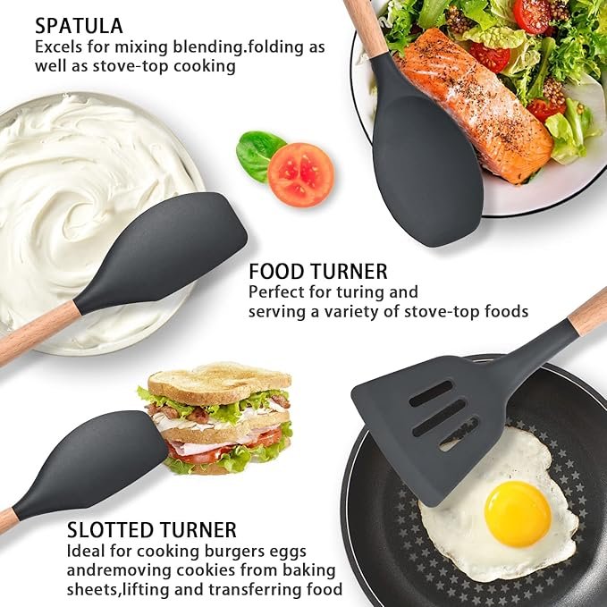 - HEAT-RESISTANT, NON-MELTING, WOODEN HANDLE – The silicone cooking utensils can withstand temperatures up to 446°F. even if they are used in a high-temperature frying environment, they will not melt or produce smoke. The wooden handle feels comfortable and strong to hold, prevents heat transfer, so you don’t have to worry about scalding the chef’s hands. these cooking utensils set is a good gift choice for mom