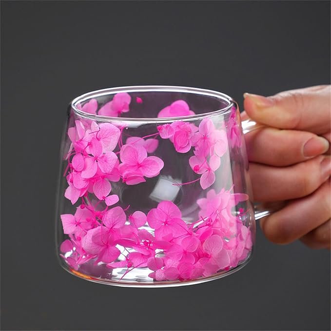 - Enjoy your favorite drink with our unique glass cup featurings real flower. Double layer designes keep your drink at the perfect temperature without condensation.