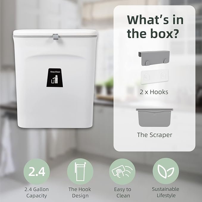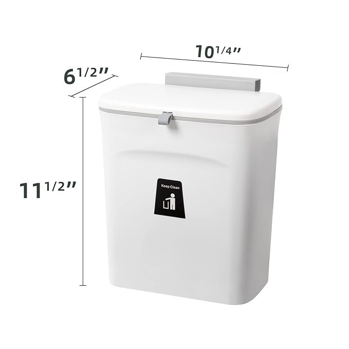 - SIZE & CAPACITY: Dimension: 10.3*6.1*11.5 inches; Capacity: 2.4 Gal. Please make sure that your cabinet door thickness is not over 0.98”if you would like to hang the trash bin on your cabinet door.