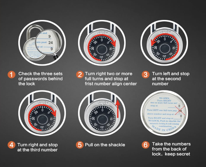 - For the first time you open this lock follow instruction from the back of the lock; Take a picuture to save in your mobile phone or write it down. Then remove the password sheet or wipe it out. 2inch 50mm wide body